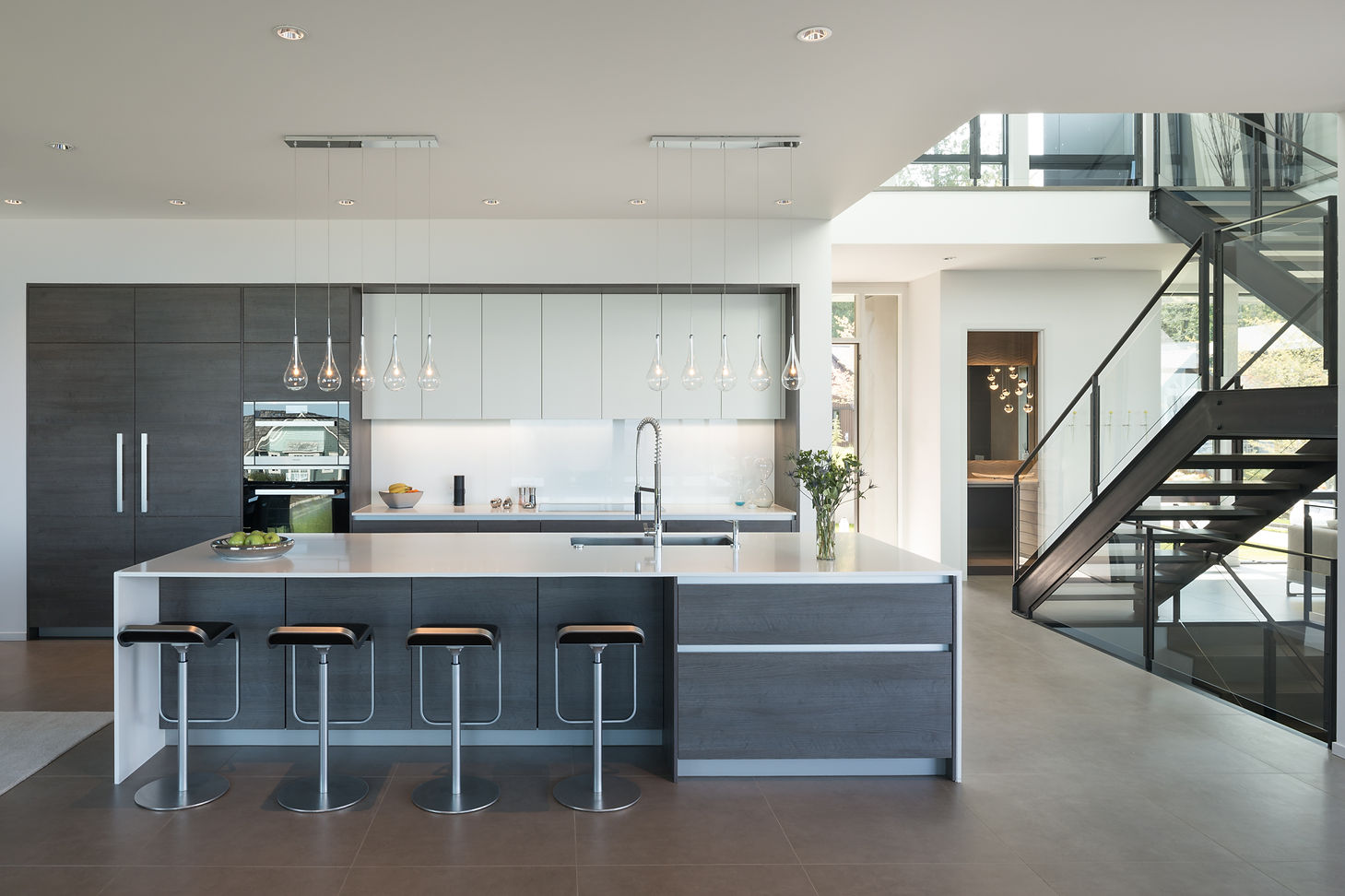 The kitchen as the center of the home – that was something the whole family wanted. So there is no living space in the traditional sense in the Madrona house, simply casually positioned seating in a range of niches. The open-plan kitchen is at the top of the stairs on the first floor and opens up to the outside with floor-to-ceiling windows. The